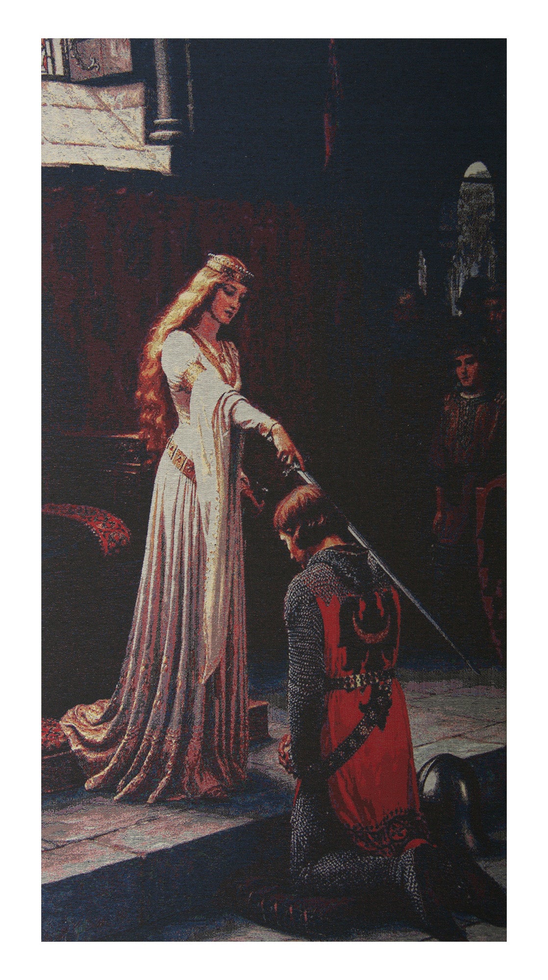 Mirroring the famous painting by British artist Edmund Leighton circa 1901, our Accolades III Tapestry depicts an accolade—a ceremony to confer knighthood. The sacred ritual is conducted with the knight-elect kneeling on a knighting stool at the feet of the monarch or Queen as depicted here. She is shown gently placing the sword on the elect’s shoulder. This medieval iconography is resplendently replicated on our tapestry in rich hues and royal colors. The tapestry is a wonderful way to weave a bit of history into your modern life and curated décor. Composed of 80% cotton, the tapestry also has a blend of viscose and polyester added for softness and luster. Ready to hang. Imported.