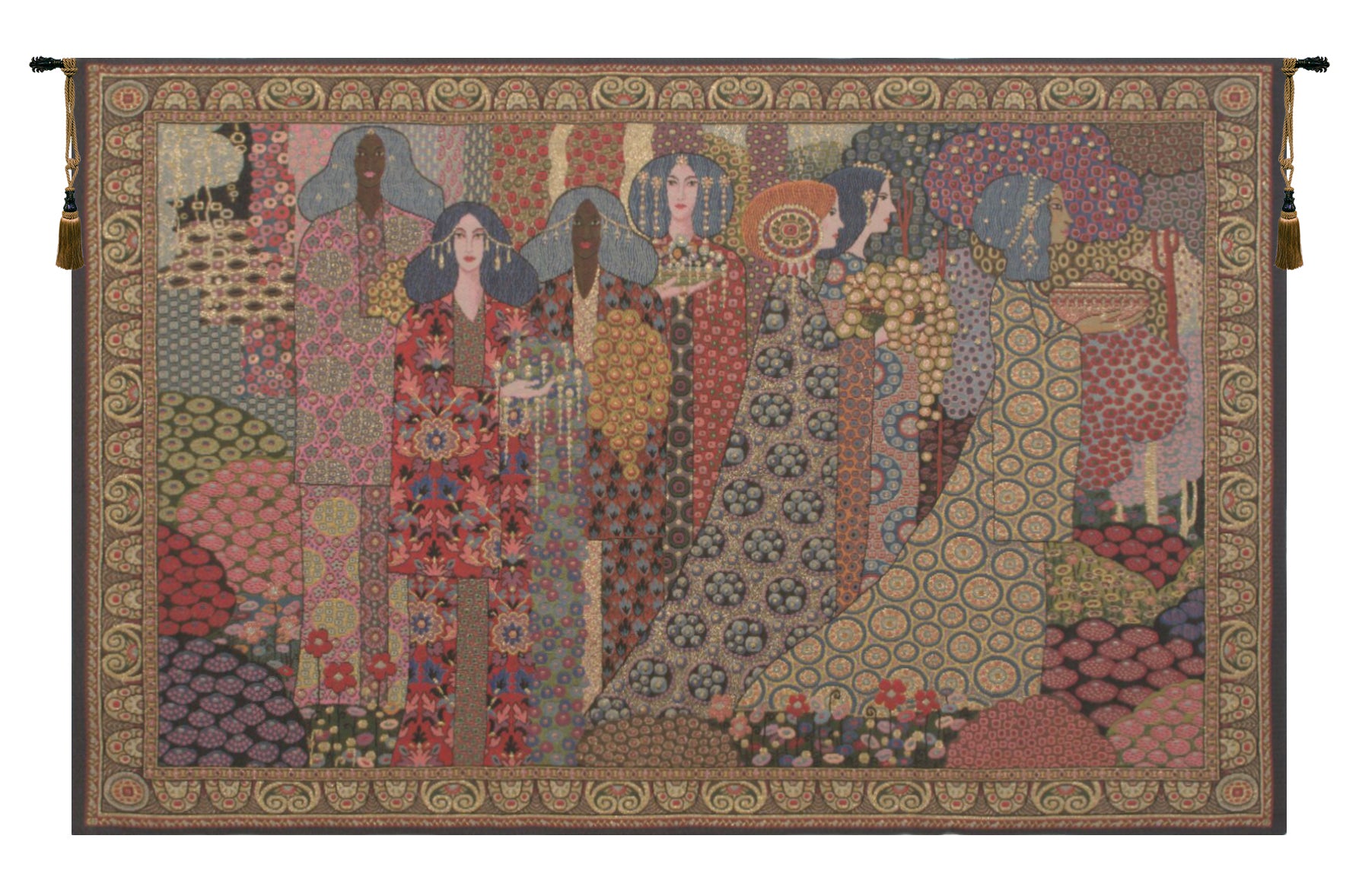 Aladin, or Aladdin, is a European jacquard wall tapestry. This Richly detailed tapestry is inspired by the figurative work of Vittorio Zecchin (1878-1947). Born on the glass-making island of Murano, Zecchin was influenced by Art Nouveau artists including Gustav Klimt.