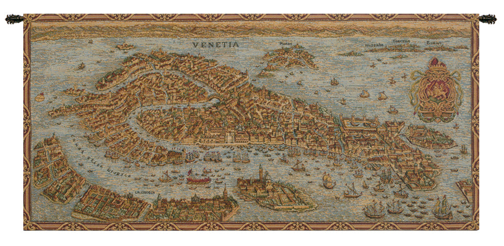Ancient Map of Venice Horizontal is an Italian jacquard woven wall tapestry. This work represents a carefully cartographed map of Venice as it would have appeared in the 17th or 18th century.