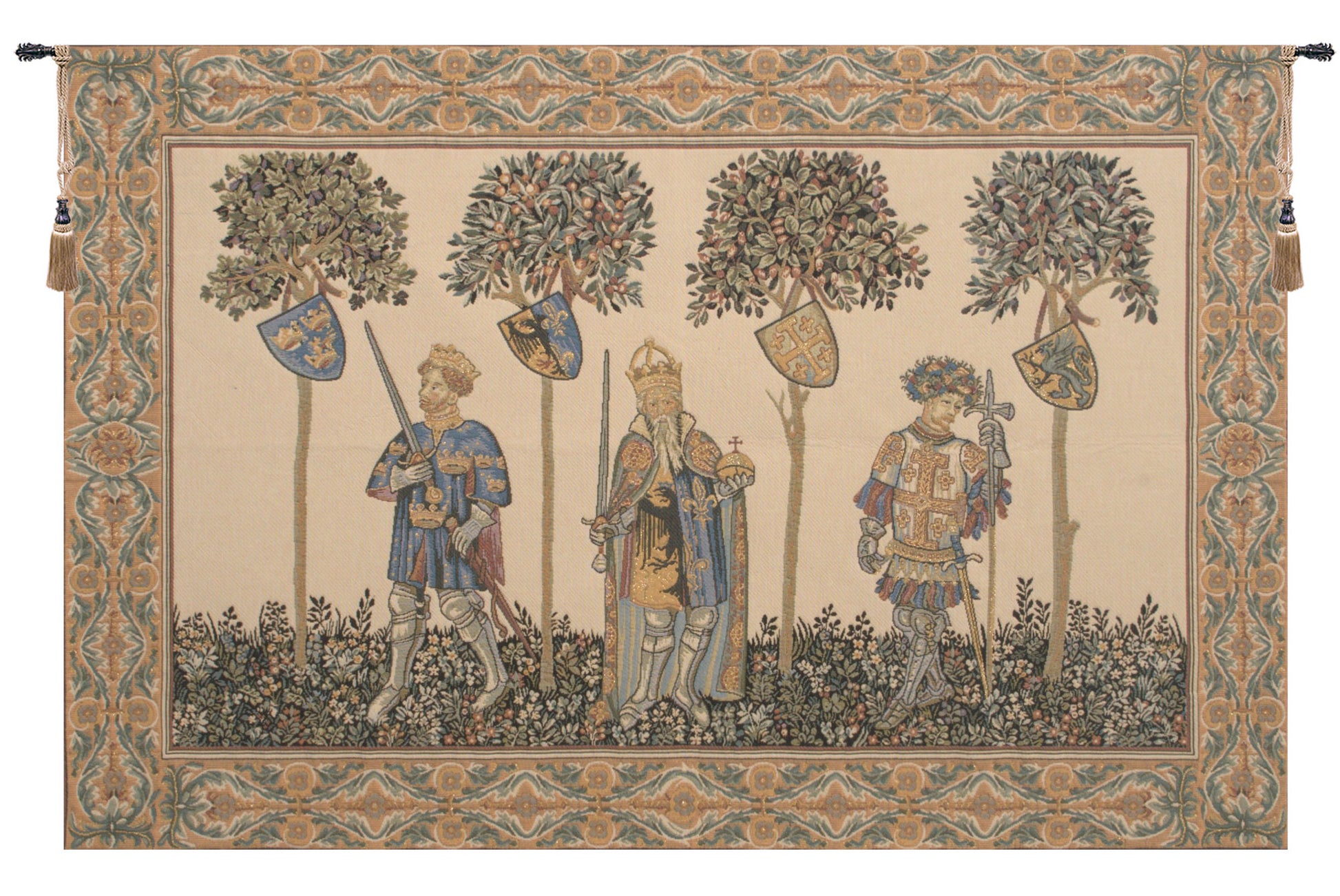 Master of the Castle II is an Italian jacquard wall tapestry also known as I Nove Prodi, or the Nine Worthies. This tapestry is an adaption of the original fresco from the Master of La Manta (1420) an anonymous master, painted in the sala baronale of the Castello della Manta, Saluzzo, Italy. The series includes depictions of nine historical, scriptural and legendary personages who personify the ideals of chivalry as were established in the Middle Ages and their female counterparts. The best known character Godfrey of Bouillon who led the first Crusade from 1096 till 1099. He was proclaimed King of Jerusalem in 1100.
