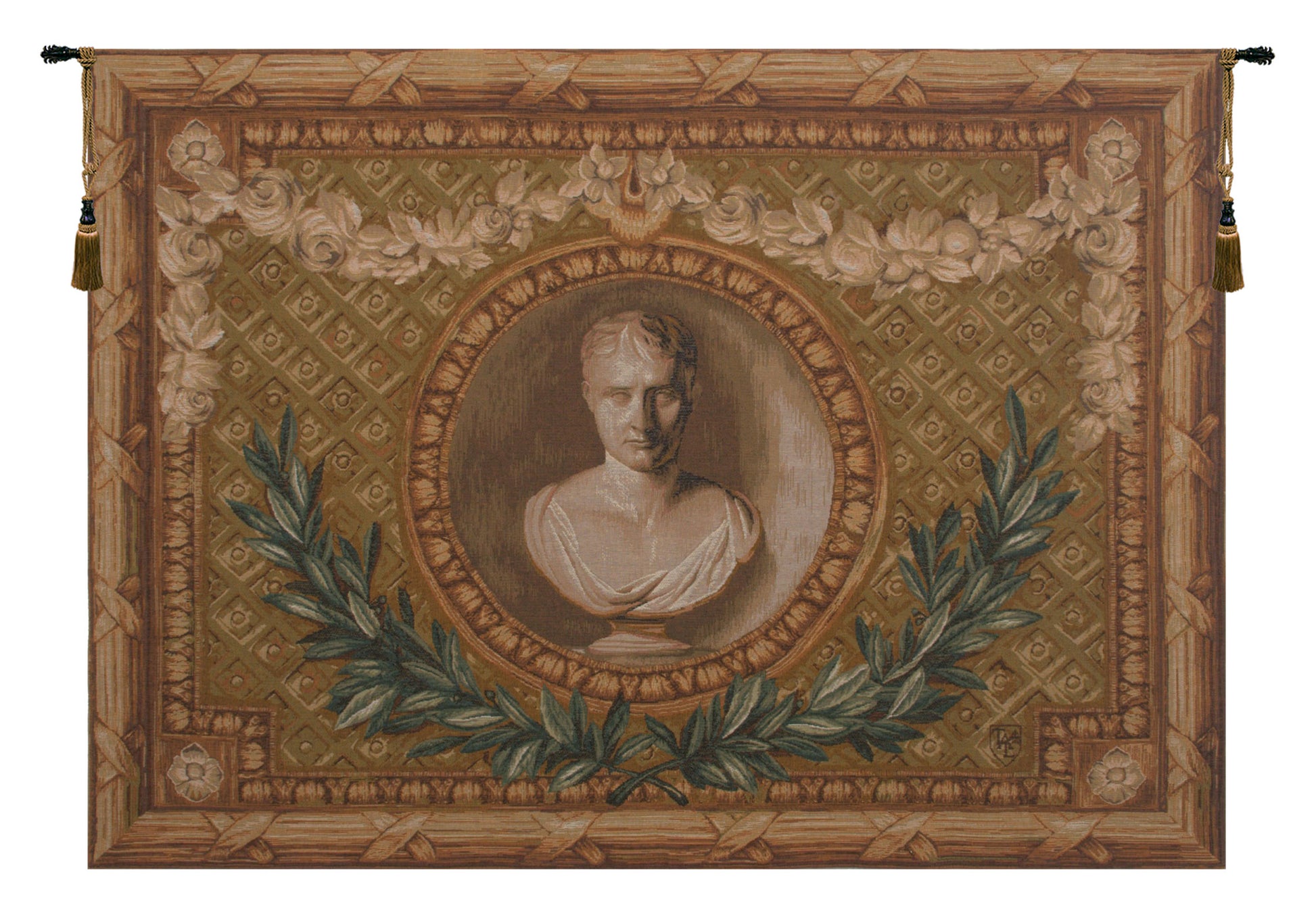 This jacquard woven wall tapestry is in the Empire style displaying a bust of the first French Emperor, Napoleon, in medallion.