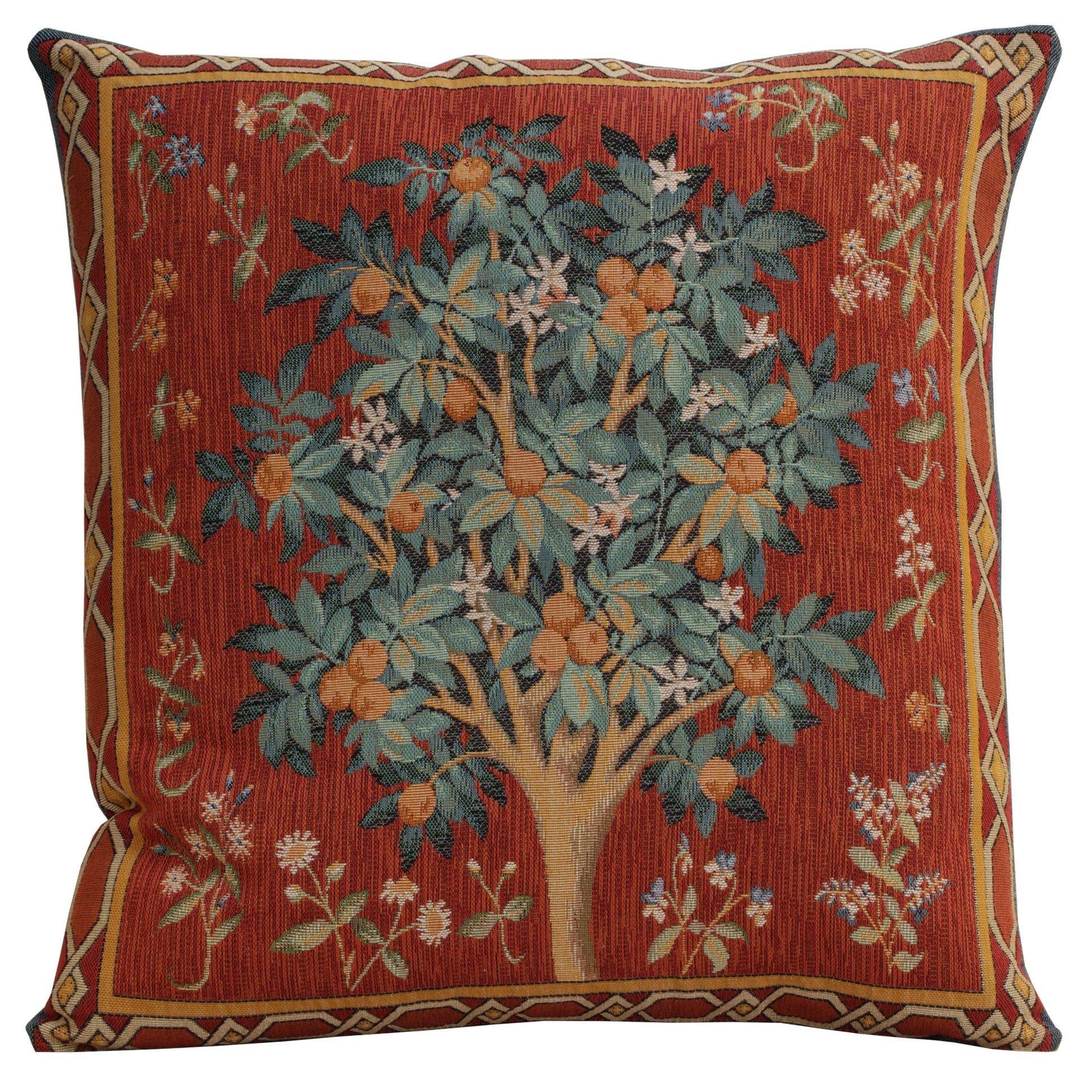This European jacquard woven tapestry cushion cover, The Orange Tree, is an extract from the famous set of 6 medieval tapestries Lady and the Unicorn. Woven around 1511, they feature the arms of Jean le Viste and are now housed in the Cluny Museum, Paris. The background is done in the Mille-fleur style.