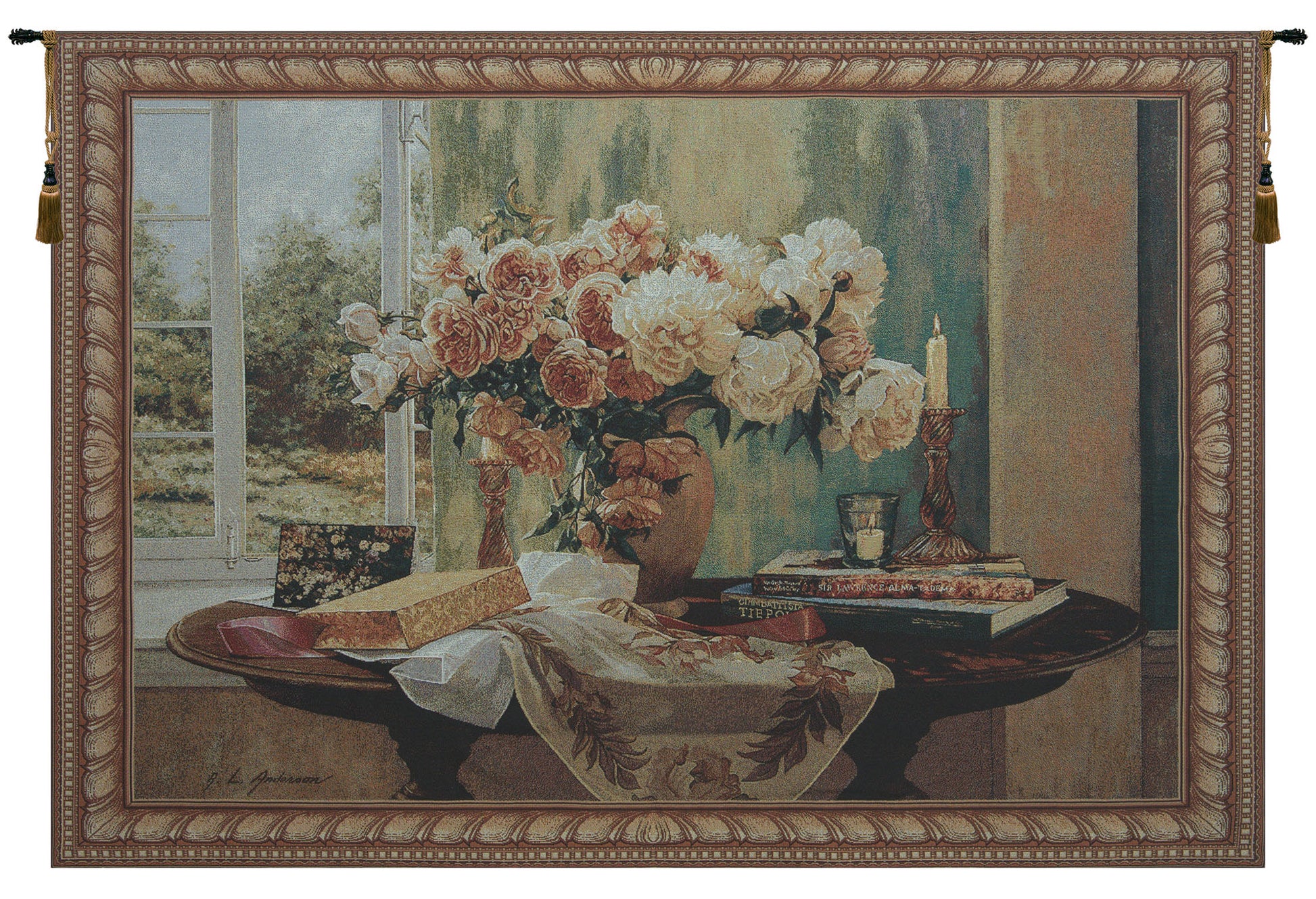 This beautiful tapestry features a very large bouquet of slightly drooping pink and white carnations sitting atop a table covered in books and candles. You can see a large window looking out into a yard with large round trees in the background.