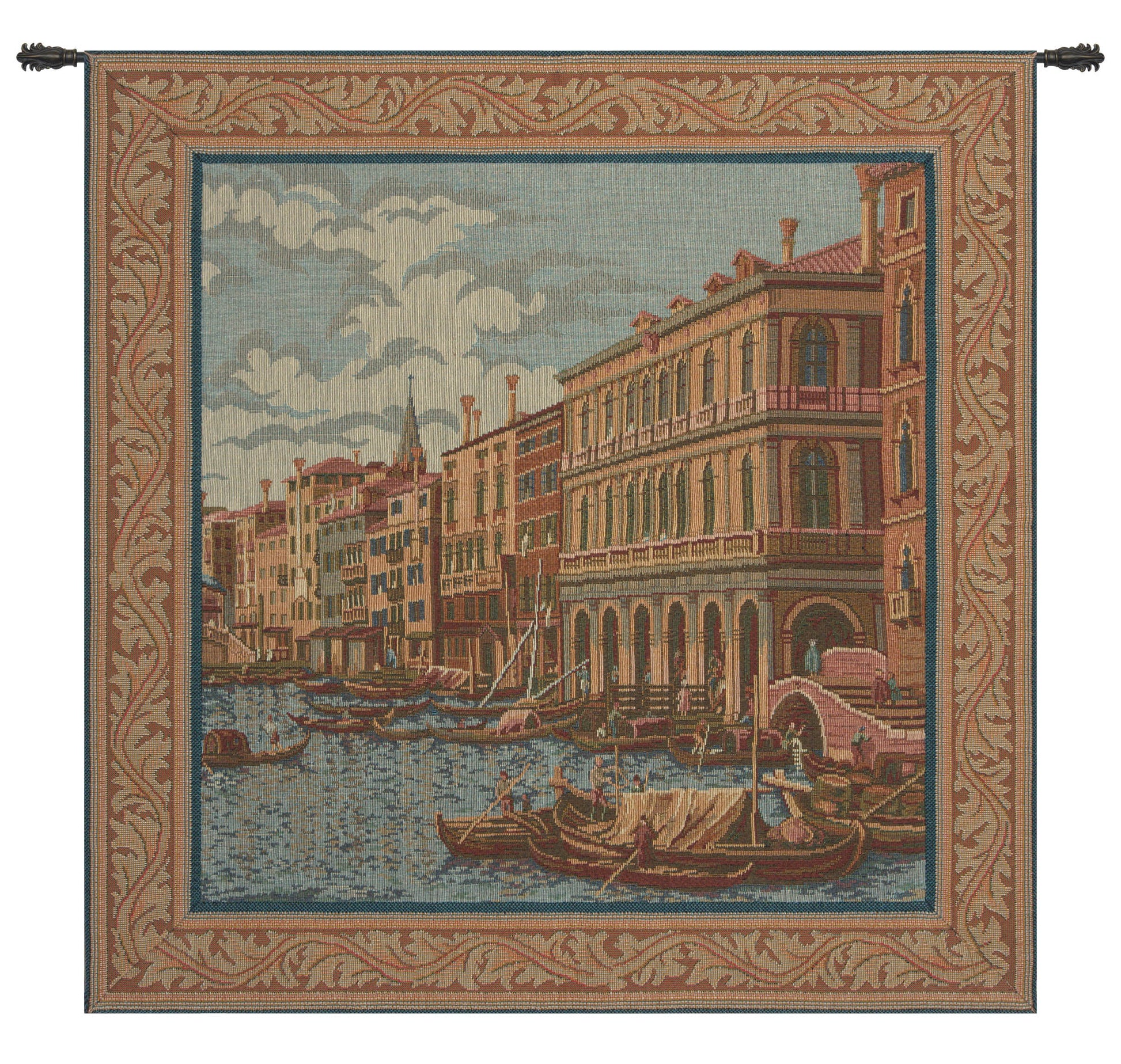 Shore on the Large Canal is an Italian jacquard wall tapestry. This historical urban scene is from the one of the busiest canals of Venice. The banks of the Grand Canal are lined with more than 170 buildings, most of which date from the 13th to the 18th century, and demonstrate the welfare and art created by the Republic of Venice. The noble Venetian families faced huge expenses to show off their richness in suitable palazzos; this contest reveals the citizens’ pride and the deep bond with the lagoon.