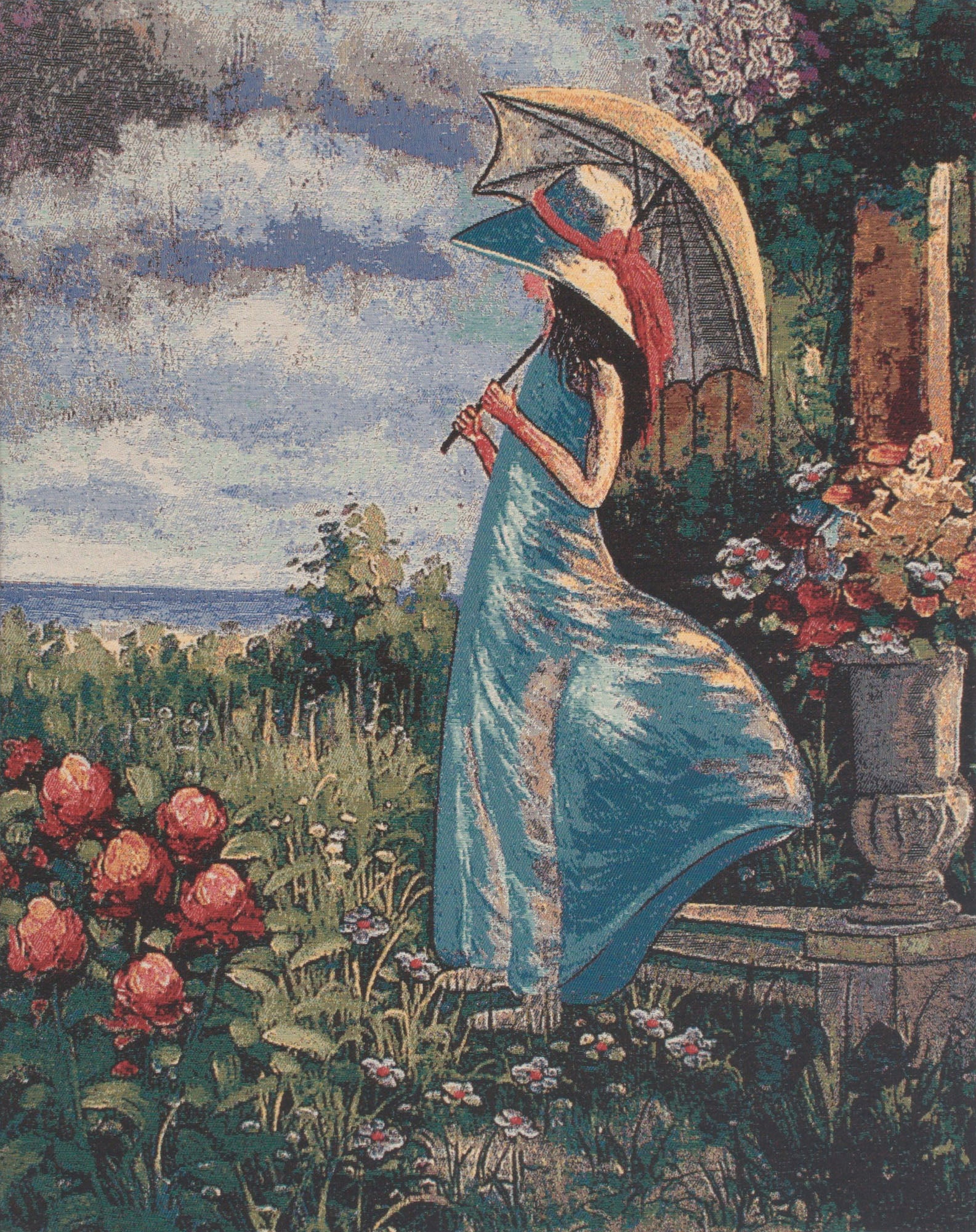 When the Wind Blows is a woven tapestry stretched wall panel depicting a dark haired woman in a blue dress holding a parasol. The wind picks up her locks and the fabric of her dress as she looks outward toward the ocean. The beach atmosphere lends a brightness to your home decor.