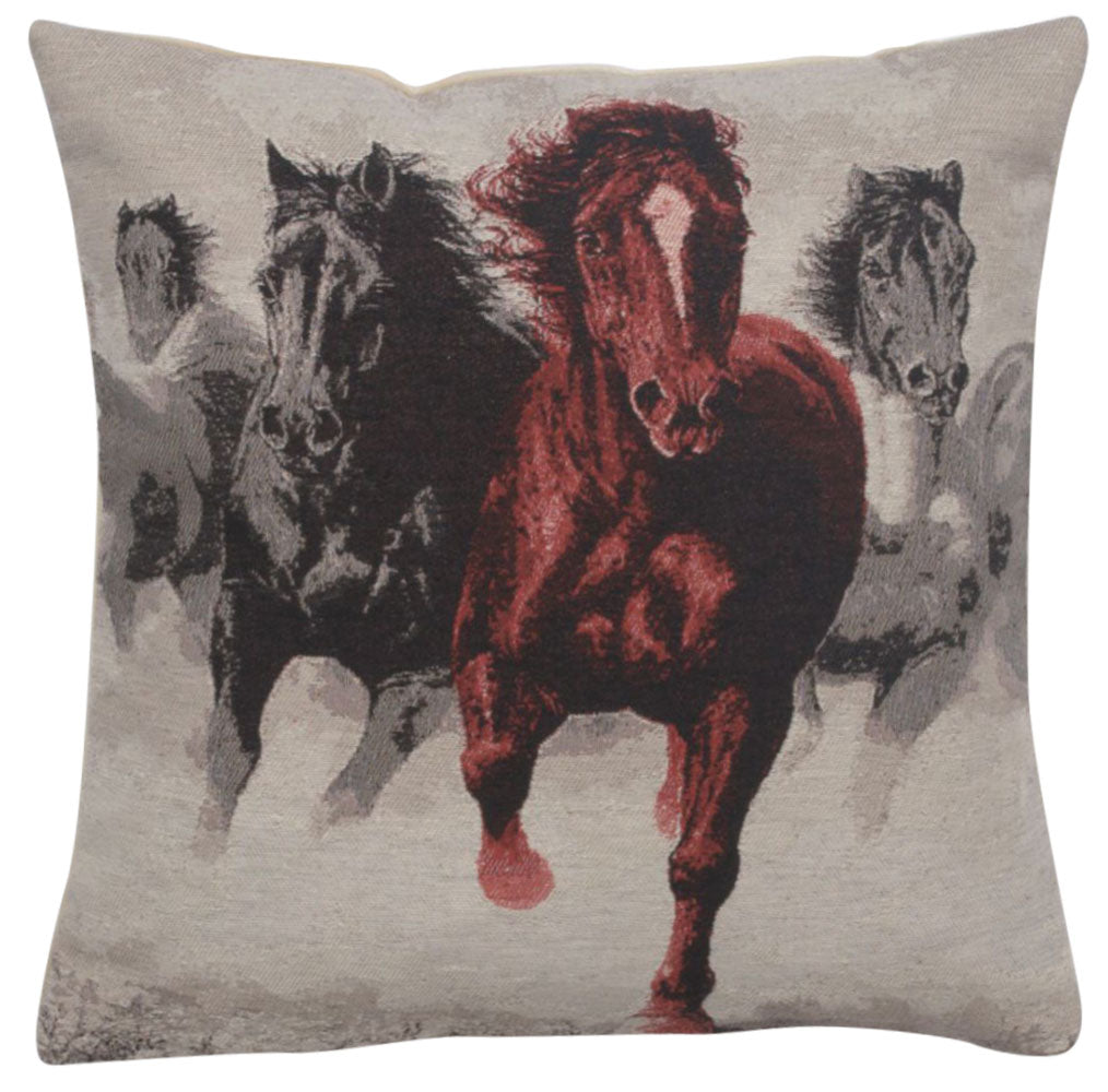 Wild and free, this woven tapestry designer cushion cover depicts a band of wild horses galloping. Done in primarily black and white, with a subtle tone variation of creams and browns. A perfect addition to any equestrian collector's home décor.
