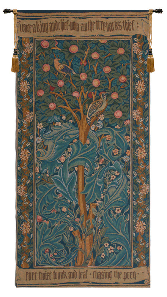 Woodpecker with Verse was designed in 1885 by William Morris and based on his poem about Picus, the Italian King who was transformed into a woodpecker in Ovid’s Metamorphoses, Book XIV. This classical work was the one of the most read books in the Middle Ages. This stunning decorative fine art French impressionist wall tapestry is also known as The Woodpecker, with parchment.
